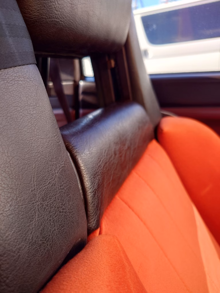 The fabric may not be the perfect choice, but the stitching looks good, and closely resembles the OEM pattern. Also, they’ve nailed the brown leather part: While the leather is slightly more patterned than the original, the color looks like a perfect match. Note that the side parts on the head rest are not included in the set, and these are the original ones that are now 40 years old. The original leather tends to turn dark blueish after the years – originally, it would have been a very dark brown color.