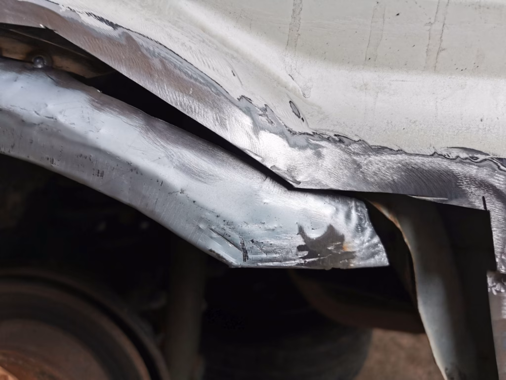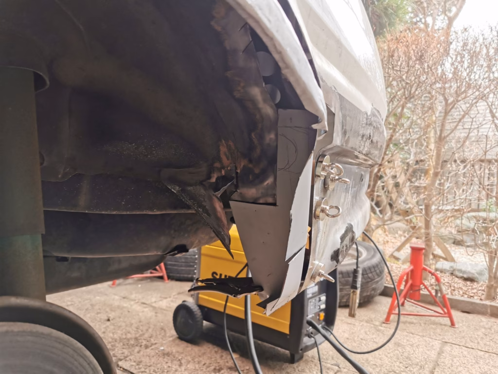The outer wheel arch in the process of being welded on. Similar to OEM, the outer and inner wheel arch are welded together using spot welds on the bottom seam.