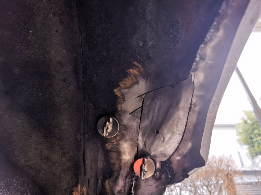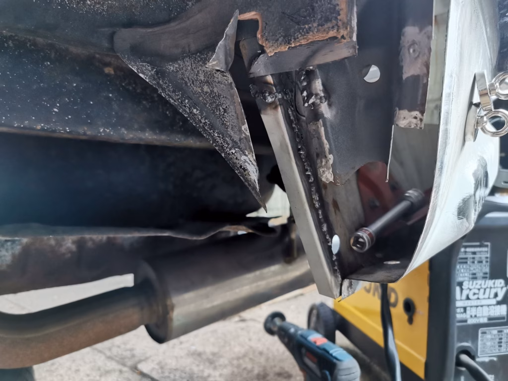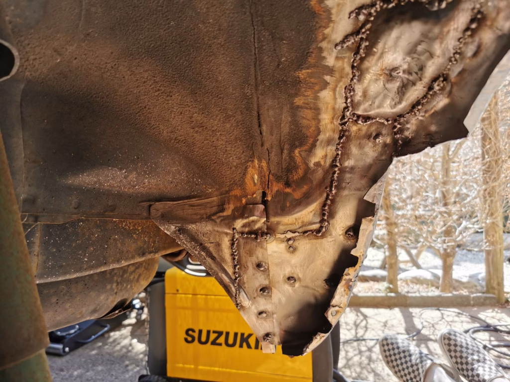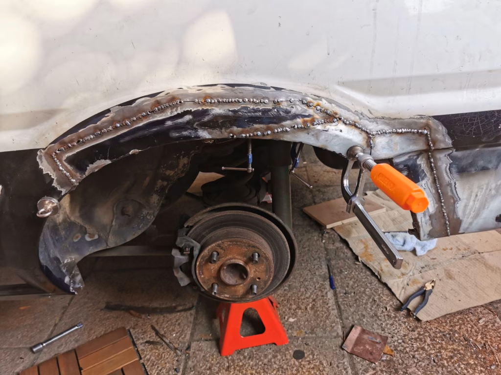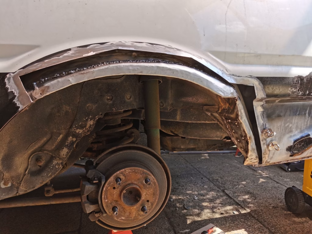 The welding work is now almost completed. The outer wheel arch was made using three parts: the left and right piece are still the original metal that I put back after removing the surface rust, and the middle part was fabricated. I did not use a repair piece.